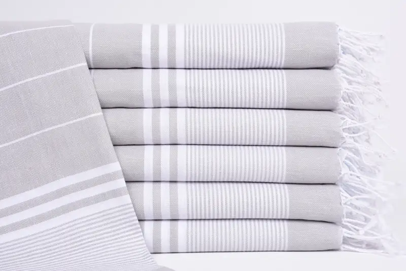 The Turkish Tea Towel is composed of 100 percent organic cotton, ensuring high absorbency and durability. Characterized by a hand-woven construction, the towels measure 40x24 inches or 100x60 centimeters, with a weight of 120 grams or 4.2 ounces, allowing a tolerance of 1-2.5 cm due to the weaving process.