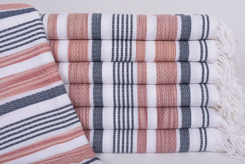 The Turkish towels are crafted from 100% organic cotton, ensuring high absorbency and comfort. Each towel measures 70x36 inches, equating to 180x90 centimeters, with a slight deviation possible due to hand-weaving. Weighing 306 grams or 10.8 ounces, these towels exhibit consistent quality.