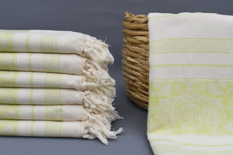 The product incorporates organic cotton, ensuring hypoallergenic properties and high absorbency. Characterized by a 70"x40" dimension translating to 180x100 cm, these towels weigh 300 grams or 10.6 ounces. Tolerances in hand-weaving are within 1-2.5 cm.