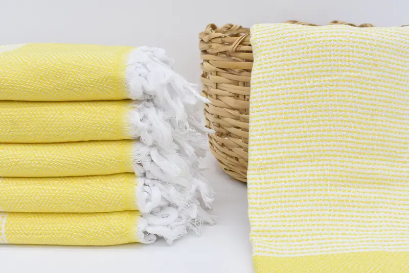 Characterized by its 100 percent organic cotton composition, the 70"x40" Yellow Diamond Towel ensures superior absorbency and a soft touch. The towel's dimensions translate to 180x100 cm, with a slight tolerance of up to 1-2.5 cm in size due to hand-weaving techniques, and it weighs 360 grams. Ensuring intricate embroidery customization, the towel can be personalized with monograms, names, or dates, adding a special touch to special occasions.