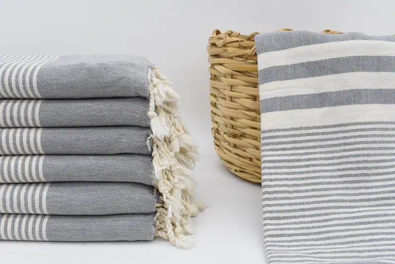 Turkish cotton towels are characterized by their material composition, ensuring optimal absorbency. The bath towel is crafted from 100 percent organic cotton, resulting in a lightweight yet durable product. Dimensionally, it measures 70x40 inches or 180x100 cm, with a weight of 340 grams or 12 ounces. Tolerances in hand-weaving may result in size variations of up to 1-2.5 cm.
