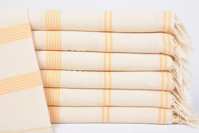 The 70"x36" Mustard Striped Towel is made from 100 percent organic cotton, ensuring hypoallergenic properties and enhanced absorbency. Characterized by a sub-category of bath towel, the product boasts dimensions of 70x36 inches or 180x90 cm with a tolerance of up to 2.5 cm due to hand-weaving. The towel weighs 290 grams, providing a balance of weight and comfort.