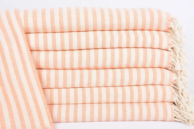 The Turkish Tea Towel is a product crafted from 100 percent organic cotton, ensuring a sustainable and high-quality fiber composition. The towel's absorbency is complemented by its dimensions, measuring 40x24 inches or 100x60 centimeters, with a weight of 130 grams. The hand-weaving process results in a tolerance of 1-2.5 centimeters, ensuring consistency in size.