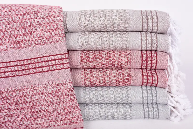 The towels are composed of 100 percent natural linen, ensuring a durable and absorbent fabric. Resulting in a product characterized by high quality and longevity. The dimensions of each towel are 70x36 inches or 180x90 centimeters, with a tolerance of up to 2.5 centimeters due to hand-weaving processes. Additionally, the towels weigh approximately 340 grams or 12 ounces.