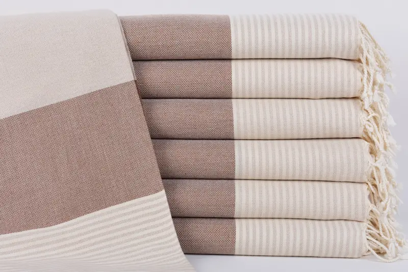 The Turkish towels are crafted from 100 percent organic cotton, ensuring exceptional softness and absorbency. Characterized by their dimensions of 67x40 inches or 170x100 centimeters, these towels weigh approximately 300 grams. Hand-weaving results in tolerances of up to 2.5 cm in size.