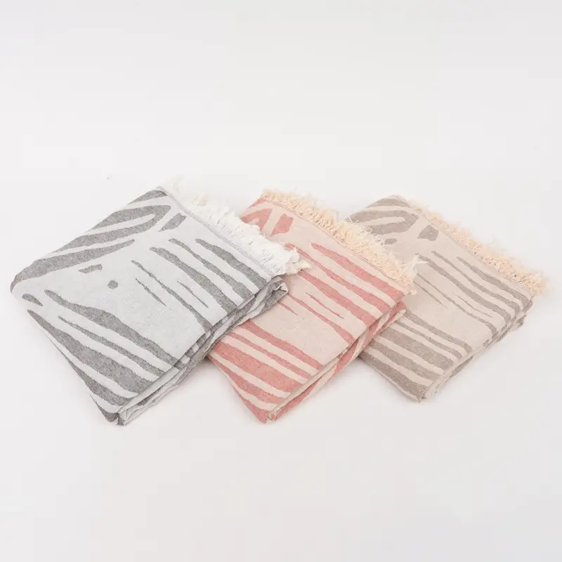 Characterized by 100 percent organic cotton material, these beach towels offer high absorbency ensuring efficient moisture management. Dimensions are specified as 70x40 inches or 180x100 centimeters, with a tolerance of 1-2.5 centimeters due to hand weaving. The weight of the towels is 320 grams or 11.3 ounces.
