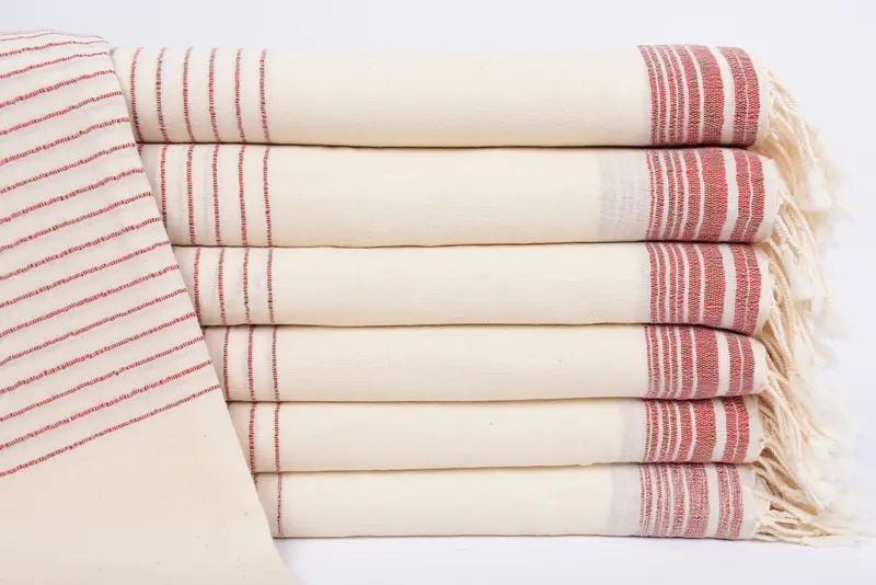 The Organic Beach Towel, characterized by its material composition of 100 percent organic cotton, ensures superior absorbency and breathability. Resulting in a lightweight and durable textile, the towel's dimensions are 36x67 inches or 90x170 cm, weighing 200 grams. Hand-weaving tolerances may result in minor size variations of up to 2.5 cm.