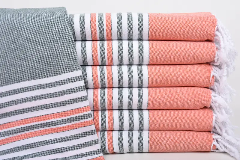 The 40x67 inches dark green-orange cotton towel is characterized by its 100% natural material composition, ensuring superior absorbency. The hand-woven dimensions of 67x40 inches translate to 100x170 centimeters, with a slight tolerance of 1-2.5 centimeters in size due to the weaving process. The towel weighs 220 grams, making it lightweight and portable.