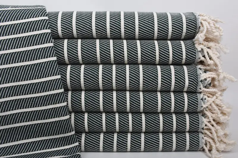 Embroidery customization is available, offering personalized monograms that enhance the towel's functionality as a beach towel, bath towel, or tablecloth. This customization is executed using high-quality embroidery threads, distinct from the weaving t...