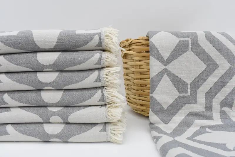 Handcrafted from 100 percent organic cotton, ensuring a highly absorbent and durable towel. Characterized by dimensions of 67 inches by 36 inches (170 cm by 90 cm) with a tolerance of up to 1-2.5 centimeters due to hand-weaving. The towels weigh 310 grams, making them lightweight yet robust.