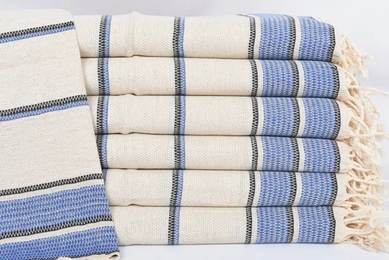 The 40"x20" Sax Blue Striped Hand Towel is crafted from 100 percent natural linen, ensuring high absorbency and durability. Resulting in a size of 40x20 inches or 100x50 cm, with a weight of 120 grams or 4.2 ounces, these towels have a tolerance of 1-2.5 cm due to their hand-weaving process.
