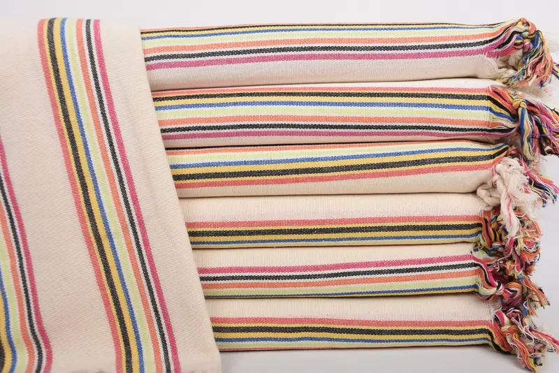 Turkish towels are distinguished by their fiber composition and exceptional absorbency, ensuring they efficiently dry and are lightweight for travel. Characterized by their precise dimensions of 70x38 inches or 95x180 cm, each towel weighs approximately 250 grams. Tolerance in hand-weaving allows for slight variances of up to 1-2.5 cm in size.