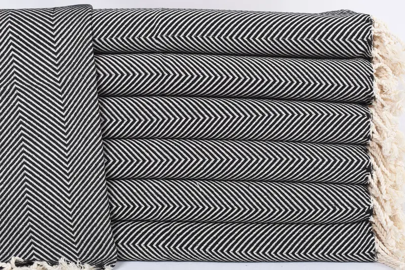 The Small Bath Towels, Travel Towel, 40"x20" Black Herringbone Tea Towel, are made from 100 percent organic cotton. Characterized by its high absorbency, the material ensures durability and comfort, resulting in a premium hand towel. The towels measure 40x20 inches, or 100x50 cm, with a weight of 100 grams or 3.5 ounces. Hand-weaving tolerances may result in slight dimensional variations of up to 2.5 cm.