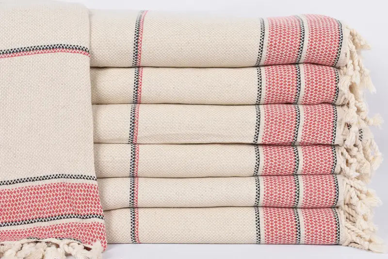 The 103"x95" Red Striped Blanket is woven from 100 percent natural linen, ensuring both durability and comfort. Measuring 260x240 cm and weighing 1200 grams, this full-size blanket features check patterns, achieved through traditional Shibori and embroidered techniques. Dimensions may vary by up to 2.5 cm due to the hand-weaving process.