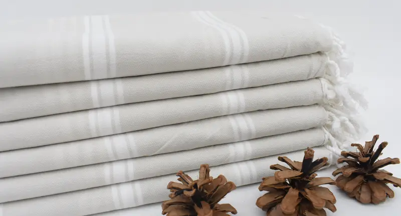 The White Striped Pool Towel is characterized by its material composition of 100% natural cotton, ensuring optimal absorbency and durability. The towel is meticulously hand-woven in Turkey, resulting in a size of 70 x 40 inches or 180 x 100 cm with minor variations due to hand-weaving tolerances. Weighing between 200 to 250 grams, this product adheres to pre-shrunk standards, ensuring consistent sizing post-production.