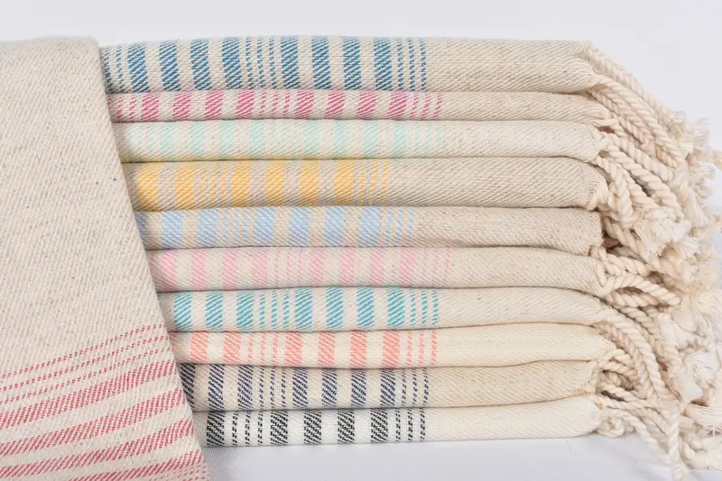 The beach towel is crafted from 100 percent natural linen, ensuring maximum breathability and high absorption capabilities. Characterized by its dimensions of 67x36 inches or 170x90 centimeters, the towel weighs 250 grams or 8.8 ounces. Weaving tolerances may vary slightly by up to 1-2.5 centimeters.