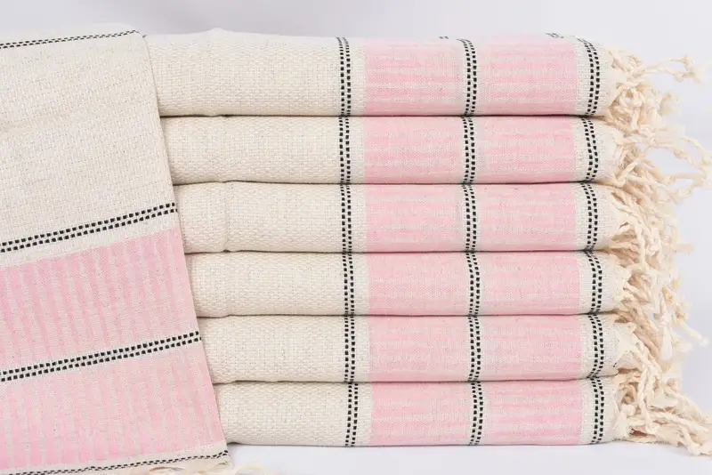 The towel comprises 100 percent organic cotton, ensuring durability and high absorbency. The dimensions of the towel are 40x20 inches or 100x50 centimeters, with a tolerance of up to 2.5 centimeters due to hand-weaving techniques. Weaving is executed with precision, resulting in a weight of 120 grams or 4.2 ounces per towel.