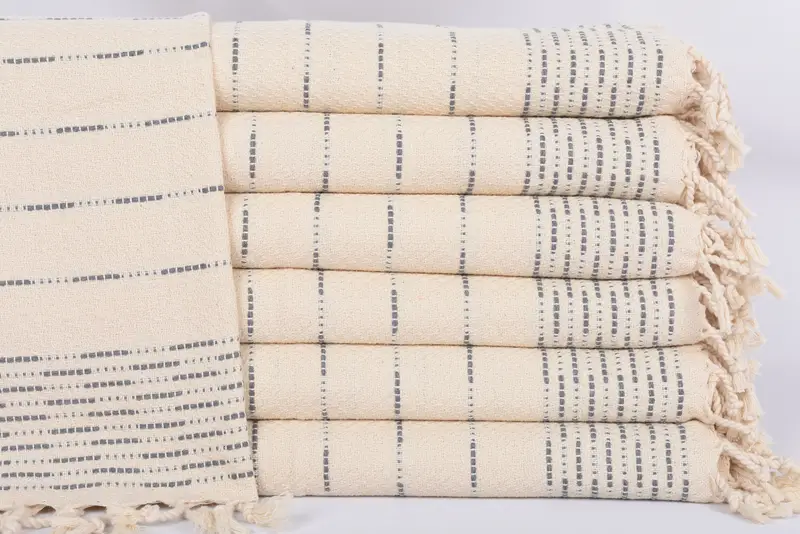 The product is characterized by its 100 percent organic cotton composition, ensuring high absorbency and softness. Dimensions are specified as 36x18 inches or 90x45 centimeters, with a tolerance of 1-2.5 centimeters due to hand-weaving techniques. The weight of the towel is 140 grams, contributing to its durability.