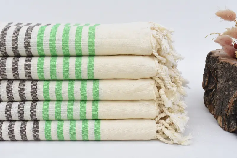 Characterized by the utilization of 100 percent organic cotton, these Turkish towels exhibit superior absorbency and durability. Resulting in a product that is both environmentally friendly and high quality, the fiber composition ensures softness and moisture retention. Measurements of the towels are 70x40 inches or 180x100 cm, with a tolerance of 1-2.5 cm due to hand-weaving techniques.