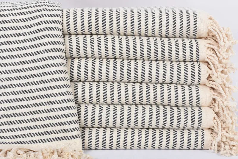The towel is characterized by its 100 percent organic cotton composition, ensuring superior absorbency and breathability. Resulting in a lightweight yet durable product, it features a dimension of 70x40 inches or 180x100 centimeters. Due to its hand-weaving process, the dimensions may vary by up to 2.5 centimeters.