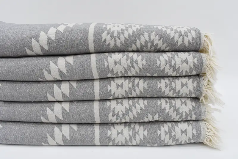 The Turkish Towel Beach towel is crafted from 100 percent organic cotton, ensuring high absorbency and breathability. Characterized by a gray primary color and white secondary accents, this 70x36 inches (180x90 cm) bath towel has a tolerance of up to 1-2.5cm due to hand-weaving, making each piece unique. The product weighs 320 grams (11.3 ounces), providing durability for diverse uses.