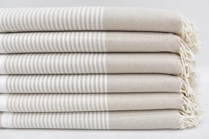 Our beach towel, characterized by its Turkish Bath Towel variant, is crafted from 100% natural cotton, ensuring exceptional softness and high absorbency. Ensuring precise dimensions, the towel spans 70" x 40" inches or 180cm x 100cm, with tolerances of up to 1-2.5cm due to hand-weaving. This results in a weight of 8-10 ounces or 250-300 grams.