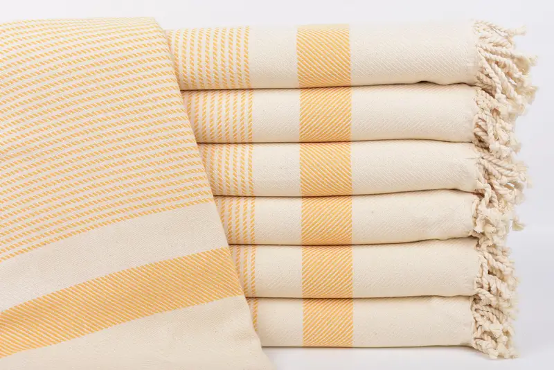 Constructed from 100 percent organic cotton, the towel ensures high absorbency and breathability. Resulting in a lightweight yet durable product, the material choice enhances comfort and longevity. Characterized by a 70x40 inches dimension (180x100 cm), the towel weighs 400 grams (14.1 ounces), with a tolerance of 1-2.5 cm due to hand-weaving.