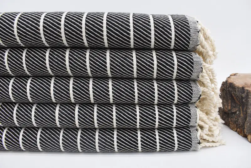 These towels are woven from 100 percent organic cotton, ensuring softness and absorbency. Characterized by their dimensions of 75x40 inches or 190x100 cm, each towel weighs 560 grams or 19.8 ounces. Hand-weaving tolerances may result in minor size variations of up to 2.5 cm.