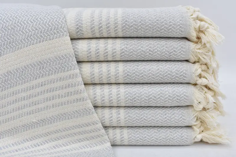 The product is characterized by its use of 100 percent organic cotton, ensuring a natural and sustainable option. The towels, woven in Turkey, exhibit dimensions of 70x40 inches or 180x100 centimeters with a tolerance of up to 1-2.5 centimeters due to hand-weaving. The weight of each towel is 400 grams or 14.1 ounces, providing a substantial and absorbent feel.
