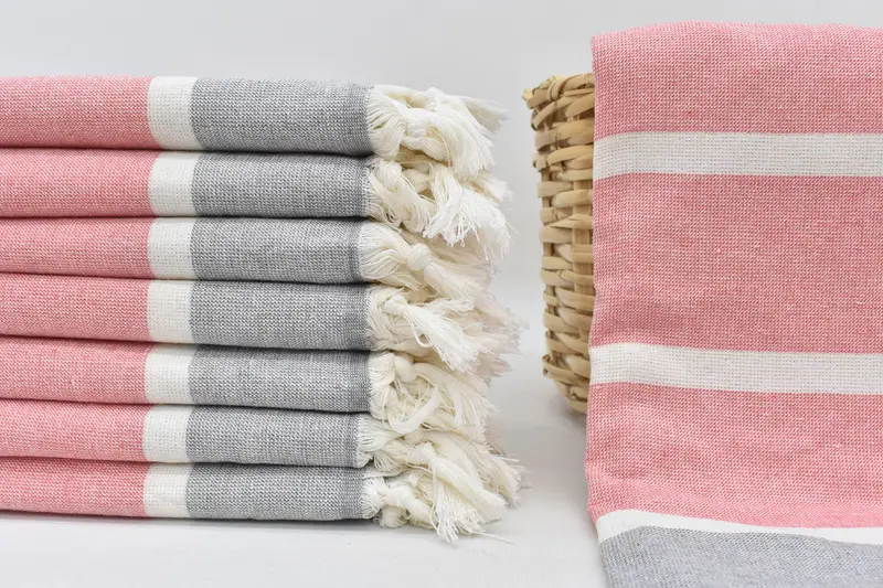 The towels are made of 100 percent organic cotton, ensuring high absorbency and breathability. Characterized by a size of 36x18 inches or 90x45 cm, these towels maintain a weight of 120 grams, with a tolerance of 1-2.5 cm due to hand weaving.