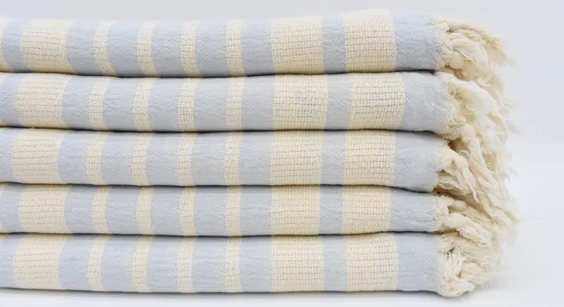Produced from 100 percent organic cotton, these towels ensure high absorbency and soft texture. Characterized by their dimensions of 70x34 inches (180x85 cm), these towels weigh approximately 320 grams or 11.3 ounces. Due to hand-weaving, sizes may vary by up to 1-2.5 cm.