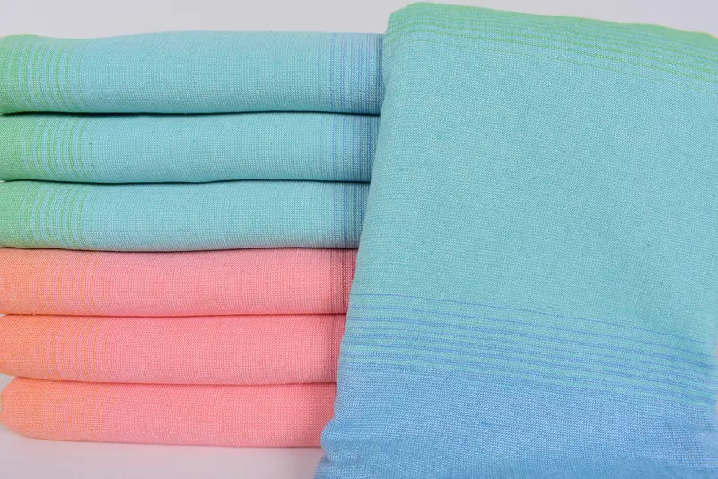 Turkish cotton is a primary material, ensuring high absorbency and durability. Characterized by its 100 percent organic cotton composition, it absorbs moisture efficiently, resulting in quick drying. Dimensions are specified at 67x40 inches or 170x100 cm with a tolerance of 1-2.5 cm due to hand-weaving.
