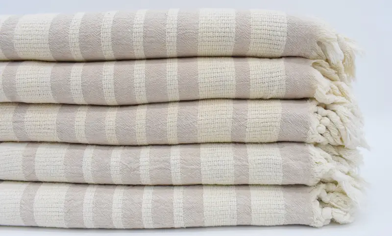 These beach towels are woven from 100 percent organic cotton, ensuring a soft texture and high absorbency. Characterized by their dimensions of 70x34 inches (180x85 cm) and a weight of 320 grams, the towels may vary slightly in size due to manual weaving. The production process involves meticulous hand-weaving, resulting in a tolerance of up to 1-2.5 cm in size.
