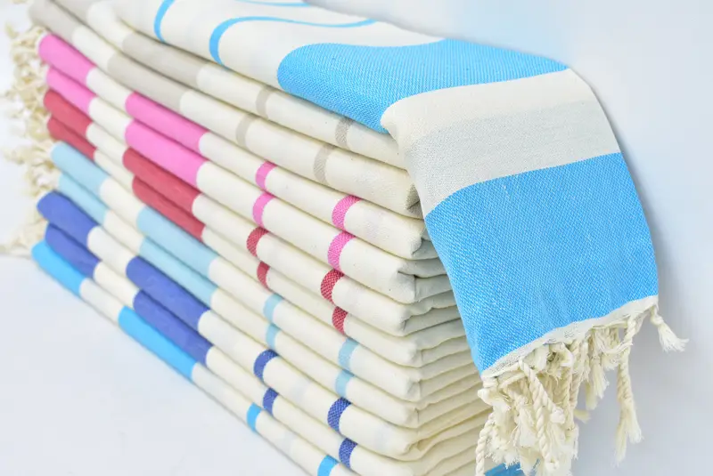 Turkish towels are characterized by their material composition, primarily 100% natural cotton, ensuring high absorbency and durability. Dimensions of these towels are specified as 70 inches by 40 inches or 180cm by 100cm, with a tolerance of up to 1-2.5cm due to hand weaving. Weight measurements range from 7 to 14 ounces, equivalent to 200 to 400 grams.