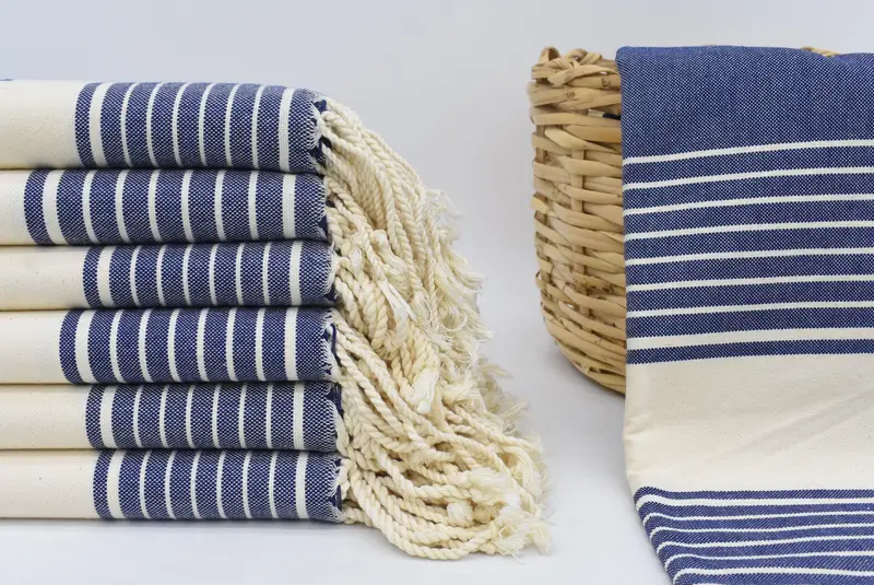 Crafted from 100 percent organic cotton, the towels ensure high absorbency and durability. Characterized by a size of 70x40 inches or 180x100 centimeters, these towels may vary slightly by up to 2.5 centimeters due to the hand-weaving process. Weighing 320 grams or 11.3 ounces, they provide substantial comfort.