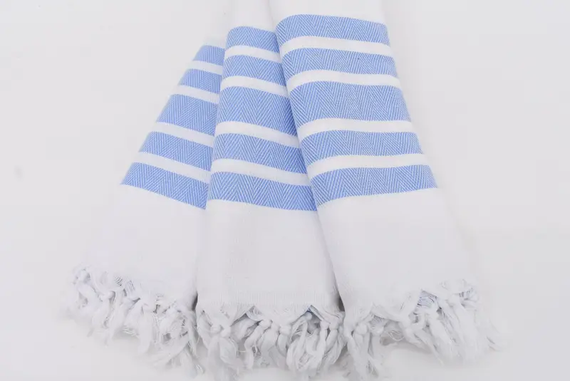 Turkish Towels ensure exceptional absorbency and durability, characteristic of 100 percent organic cotton composition. Each bath towel measures 70x40 inches or 180x100 centimeters, with a tolerance of up to 2.5 centimeters due to hand-weaving, weighing approximately 380 grams or 13.4 ounces. These towels offer an option for monogramming using high-quality embroidery threads, enhancing personalization while ensuring longevity.