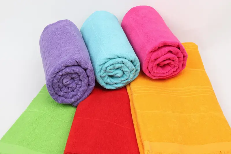 Organic cotton bath towels are characterized by their high absorbency and durability. Each towel, measuring 70x36 inches (180x90 cm), weighs approximately 420 grams (14.8 ounces) and is woven with precision resulting in a slight tolerance of 1-2.5 cm in dimensions.