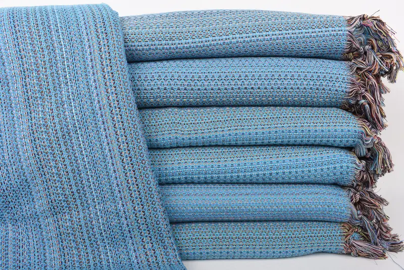 The blanket features dimensions of 89x87 inches or 225x220 cm, with a weight of 1180 grams, ensuring a substantial and cozy feel. Tolerances during the hand-weaving process may cause size variations of up to 1-2.5 cm.