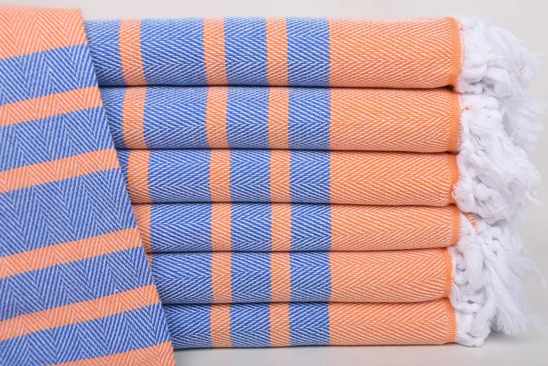 The 67"x36" Sax Blue-Orange Chevron Towel is crafted from 100 percent organic cotton, ensuring its suitability for sensitive skin and high absorbency. Characterized by a size of 67x36 inches or 170x90 cm, the towel may vary by up to 1-2.5 cm due to hand-weaving techniques. Weighing approximately 380 grams, it provides a substantial feel.