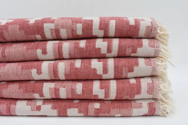 Characterized by its soft and absorbent material, this red camouflage towel comprises 100 percent organic cotton, ensuring optimal comfort and durability. Resulting in precise measurements, the towel's dimensions are 67x36 inches or 170x90 centimeters, with a weight of 340 grams or 12 ounces. Weaving tolerances may result in slight variations of up to 2.5 centimeters.