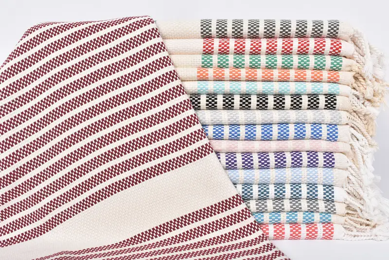 100 percent organic cotton Turkish towels ensure high absorbency and comfort. Characterized by a 75x40 inches dimension or 190x100 cm, these towels weigh 480 grams. Slight variations in size up to 1-2.5 cm are expected due to the hand-weaving process.