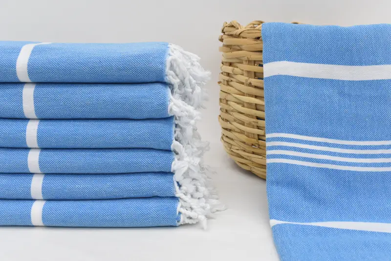 Turkish Towels are woven in Turkey using 100 percent organic cotton, ensuring exceptional absorbency and durability. Characterized by their dimensions of 70x40 inches (180x100 cm) and weighing 270 grams (9.5 ounces), these towels may vary slightly due to hand-weaving tolerances of 1-2.5cm. Each towel can be customized with embroidery featuring monograms and logos, enhancing their utility and aesthetic appeal.