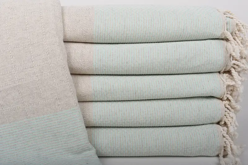 Turkish blankets are characterized by their 100% organic cotton material, ensuring superior absorbency and softness. Dimensions of the blanket span 95x95 inches or 240x240 centimeters, with a weight of 1500 grams, offering a lightweight yet cozy experience. Hand-weaving tolerances range between 1-2.5 centimeters, providing slight variations in size.