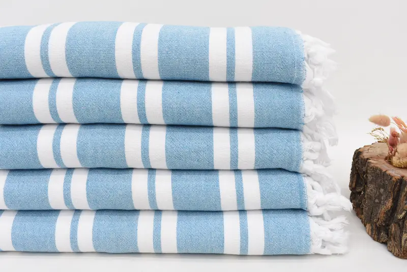 The Turkish towel is composed of 100% organic cotton, ensuring high absorbency and a soft texture for optimal comfort. Characterized by a dimensions of 67x36 inches or 170x90 centimeters, and weighing approximately 400 grams, the towel might have slight size variations of 1-2.5cm due to hand weaving. The product allows for customization through monogram embroidery, utilizing high-quality threads that enhance durability and aesthetics.