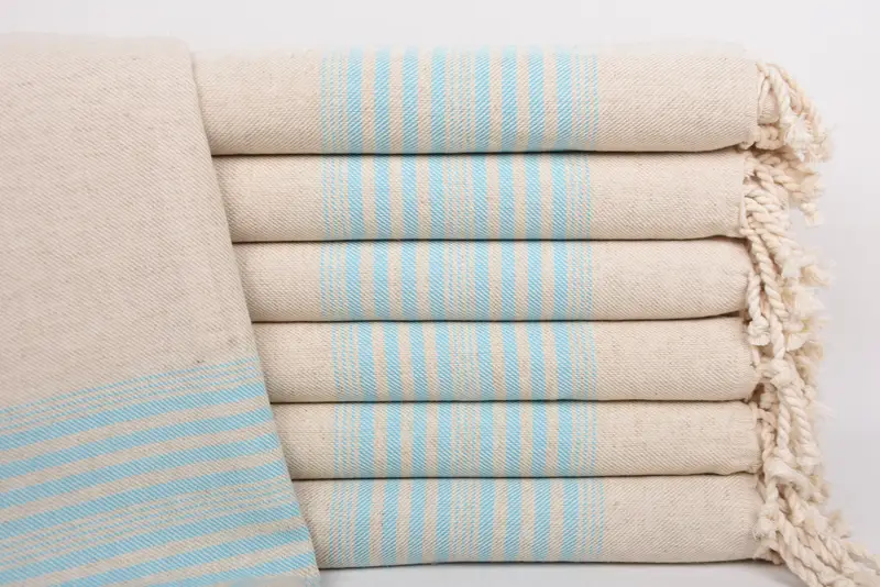 The beach towel is composed entirely of linen, ensuring both durability and high absorbency. It measures 79x40 inches or 200x100 centimeters, with a weight of 315 grams. The hand-weaving process introduces slight variations of up to 2.5 centimeters in size.