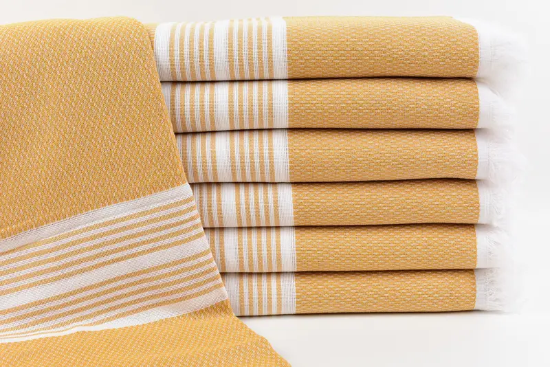 The 70"x40" mustard striped towel is crafted from 100 percent organic cotton, ensuring superior absorbency and gentle fabric texture. Characterized by a size of 70x40 inches or 180x100 centimeters, the towel weighs 260 grams with a potential variation of 1-2.5 cm due to hand-weaving. Embroidery customization is available for personalization, resulting in a pre-shrunk and durable product. Shipping is handled via DHL Express or FedEx, with delivery times up to 5 days globally. Return or exchange is not accepted for personalized products.