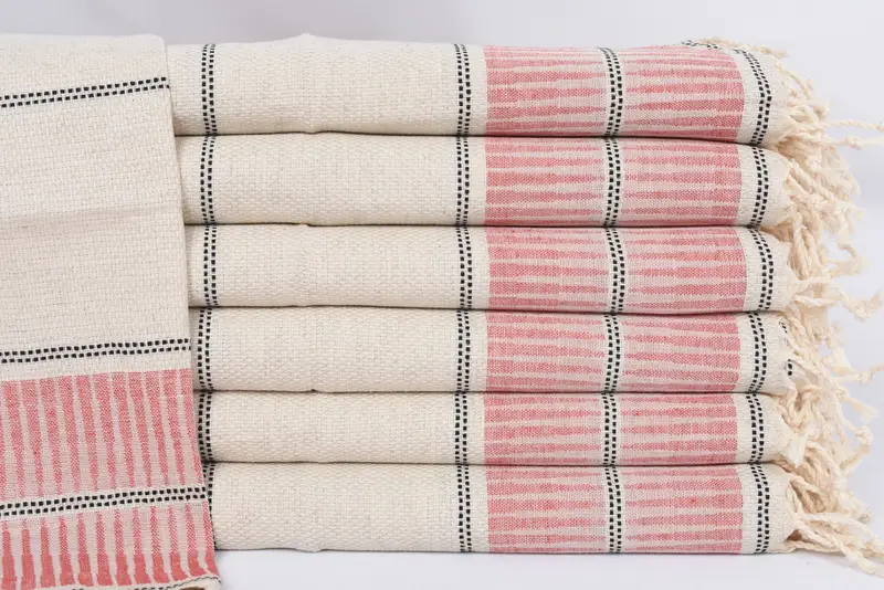 Constructed entirely from organic cotton, these towels are characterized by their high absorbency and softness, ensuring a comfortable and luxurious feel. The towels measure 40x20 inches or 100x50 centimeters, weighing approximately 120 grams. Hand-weaving tolerances may result in slight variations up to 2.5 centimeters.