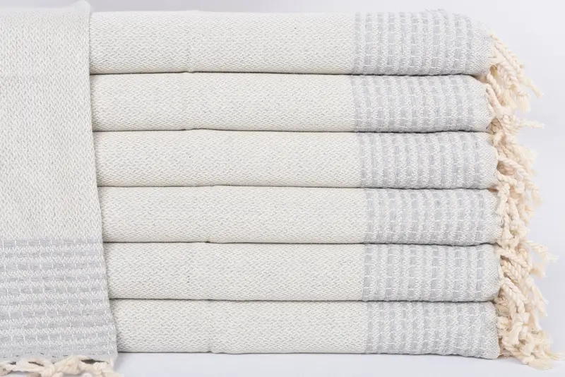 Turkish bath towels are composed of 100 percent organic cotton, ensuring high absorbency and durability. The towels measure 40x20 inches or 100x50 centimeters, weighing 120 grams or 4.2 ounces. Due to hand weaving, there might be slight dimensional variances of 1-2.5 centimeters.