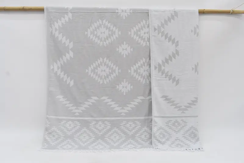 This blanket is composed of 100 percent organic cotton, ensuring high absorbency and eco-friendly luxury. Measuring 83x56 inches or 210x140 centimeters, it weighs approximately 600 grams or 21.2 ounces. Hand-weaving results in a tolerance of 1-2.5 centimeters in size.