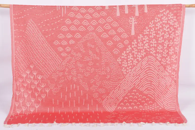 The monogram beach towel is made of 100% organic cotton, ensuring breathability and excellent absorbency. The dimensions of the towel are 67x40 inches, equating to 170x100 centimeters, with a tolerance of 1-2.5 centimeters due to hand-weaving. The towel weighs 260 grams, providing a substantial and comfortable texture.